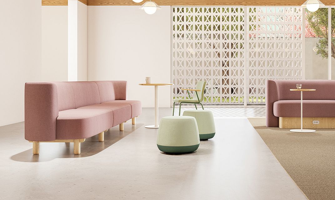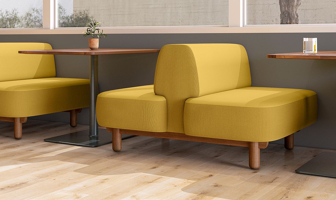 With sweeping curves and generous proportions, Del Amo brings a distinctly lounge aesthetic to dining-height seating. While most banquettes are designed as an extruded profile with a cleaved ending, Del Amo features intersecting forms and a cantilevered seat, providing a uniquely sculptural ending to sofas and banquettes. Optionally, a wrapping half-arm can be selected as the seat end. Del Amo is available in single-sided and back-to-back seating, as well as island configurations. The plinth base accommodates a variety of power configurations and can be upholstered or specified in a range of ash and walnut veneers.