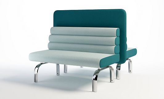 Its name meaning "sea view", Miramar's striking horizontality is achieved through stacked upholstered channels that encourage creative textile combinations. Functioning equally as an open plan space-defining seating system and as a fully customizable banquette, Miramar seating includes solid surface planters, power integration, and privacy panels. A sculptural metal base provides an airy support and is available in polished aluminum and a range of powder coat colors.
